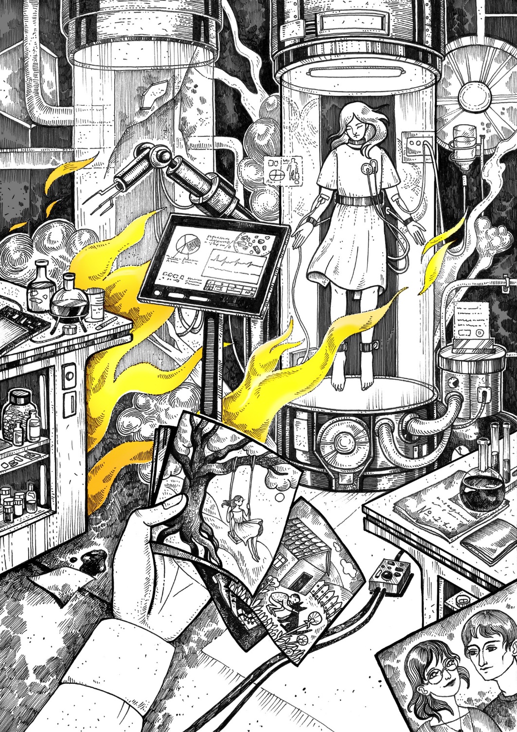 Яркий свет, белые стены, непонятная аппаратура, множество кнопочек, люди – десять, нет чуть больше, в кроватях, опутанные проводами. Спят? Мертвы? И она… Такая молодая среди мертвецов (мертвецов ли?) и белого стерильного света… Тьма поглощает…