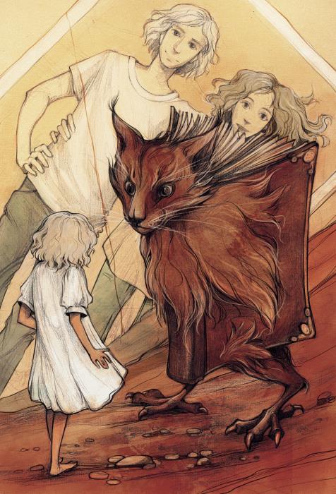 Сначала Соне показалось, что перед ней большая птица, вроде грифона. Но, присмотревшись, она поняла, что это огромная, почти в человеческий рост, книга, которая стоит на птичьих лапах. Сверху же переплёт венчала кошачья голова, треугольные уши с чёрными кисточками. Белые полосы спускались от уголков глаз к подбородку. Золотая обложка была приоткрыта, и шелестящие внутри страницы походили на крылья.