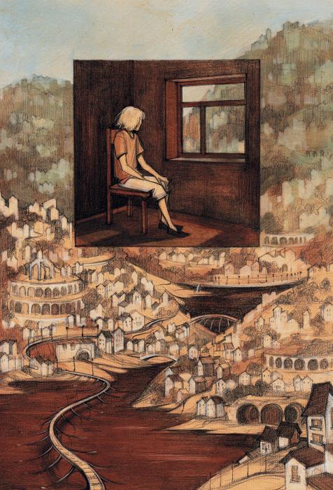 Поезд поворачивал на мост, чьи тонкие жучьи лапки уходили в воду. Город стоял в утренней дымке. Улицы прорезали его, как ручейки талый снег, ранние почтовые катера бороздили воду, оставляли пенные хвосты. Вода была всюду – синяя, тёмная, совсем другого оттенка, чем море в Агаресе. Пешеходные и сухопутные улицы карабкались на холмы, которые возвышались над городом огромными буквами «Л» – Цабран насчитал четыре возвышенности, остальное тонуло в тумане.