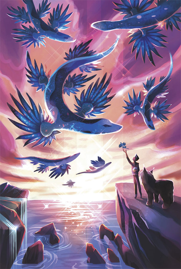 Тимур замер: по небу летела стая огромных голубых драконов. Медленно взмахивая гигантскими крыльями-плавниками, они гордо плыли по воздуху, касаясь облаков. Их вытянутые тела двигались плавно и грациозно, вспыхивая синими искрами под яркими лучами солнца.