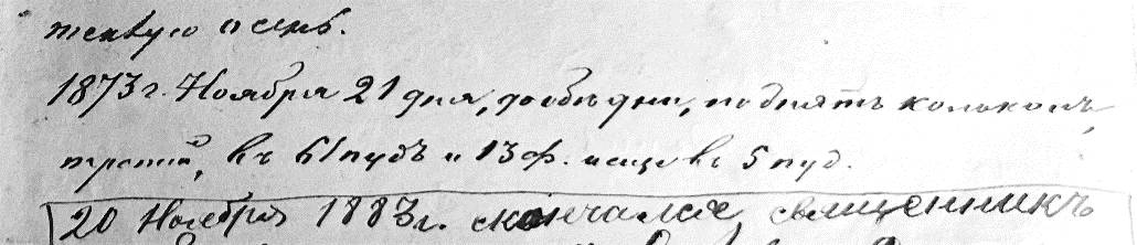 Запись из семейного «дневника» Сперанских: «1873 г. ноября 21 дня … поднят колокол третий в 61 пуд и 13 ф и еще в 5 пуд».