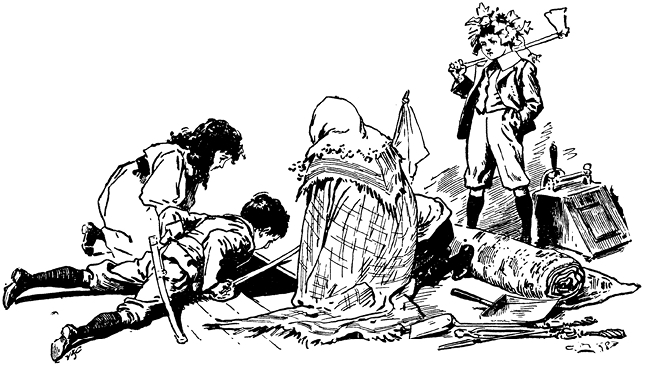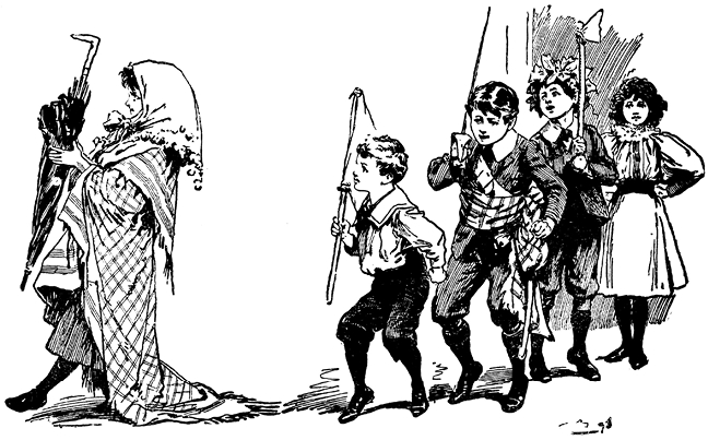 Она продолжала бы говорить ещё долго, но мы ей напомнили, что золота пока нет. К этому времени Элис накинула на себя зелёную скатерть со стола в детской, повязала голову старой сине-жёлтой салфеткой и обратилась к нам: