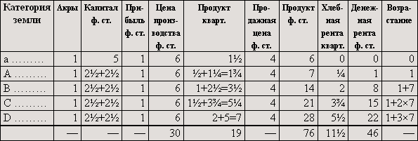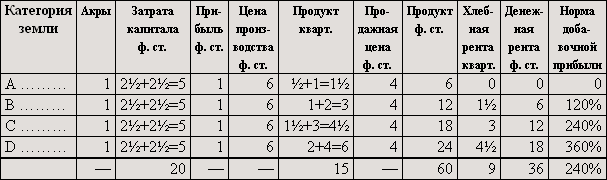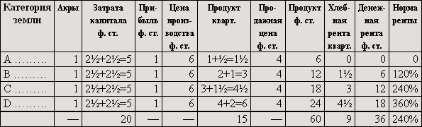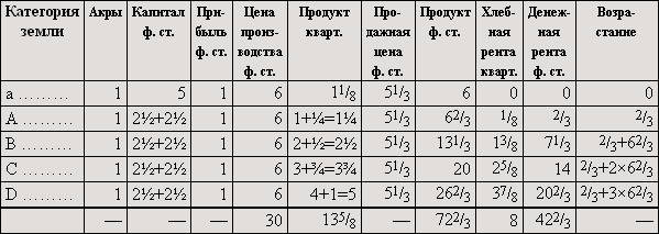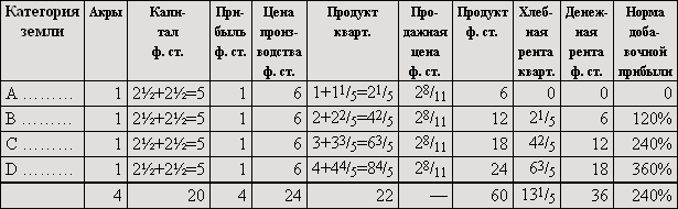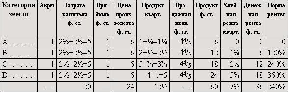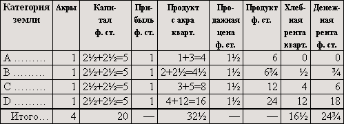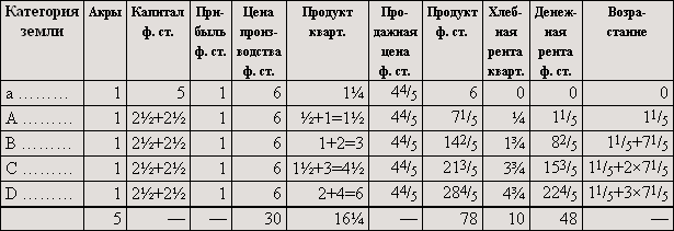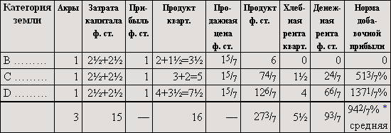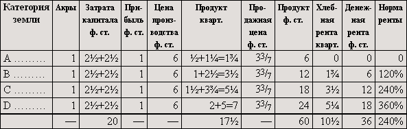 Если бы мы предположили, что дополнительные затраты капитала увеличили производительность, например, земель B и C не в такой степени, как производительность земли A, так что для земель B и C пропорциональная разница уменьшилась и увеличившееся количество продукта не возместило бы понижения цены, то по сравнению с таблицей II [денежная] рента на земле D не изменилась бы, на землях B и C понизилась бы.