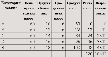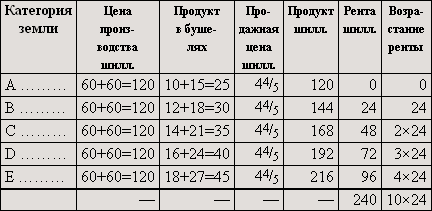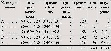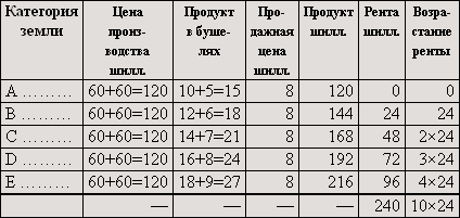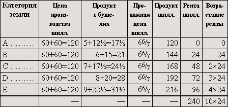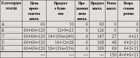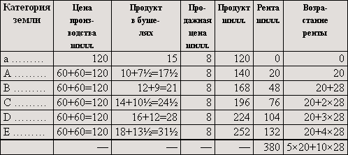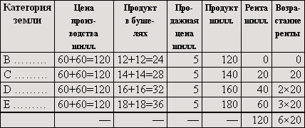 « 2: Убывающая производительность (таблица XVII). Оба эти варианта приводят к тому, что земля A перестаёт входить в число конкурирующих земель, земля B перестаёт приносить ренту и регулирует цену производства.
