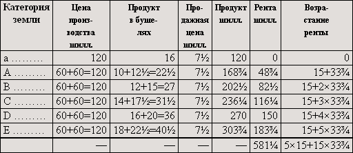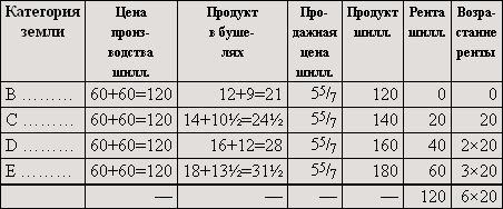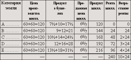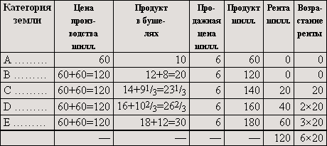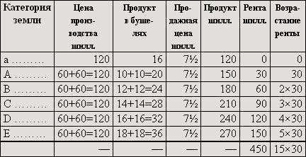 В приведённом случае две первые затраты капитала в 5 ф. ст. на земле B производят 3½ квартера, следовательно, согласно предположению, 1½ квартера ренты = 4½ фунта стерлингов. Если сюда присоединится третья затрата капитала в 2½ ф. ст., производящая лишь один дополнительный квартер, то вся цена производства (включая 20 % прибыли) 4½ квартера = 9 фунтам стерлингов; следовательно, средняя цена за квартер = 2 фунтам стерлингов. Таким образом, средняя цена производства за квартер на земле B поднялась с 15/7 до 2 ф. ст., добавочная прибыль с квартера, по сравнению с регулирующей ценой земли A, упала следовательно с 12/7, до 1 фунта стерлингов. Но 1 × 4½=4½ фунта стерлингов, совершенно так же, как прежде, 12/7 × 3½ = 4½ фунта стерлингов.