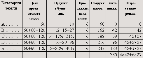 Прежде всего, что ряд рент находится друг к другу точно в таком же отношении, как ряд различий в плодородии, принимая за нулевой пункт регулирующую землю, не приносящую ренты. Рента определяется не абсолютным размером продукта, а лишь разностью в размере продукта. Будут ли различного рода земли приносить 1, 2, 3, 4, 5 бушелей или 11, 12, 13,14, 15 бушелей продукта на акр, – рента в обоих случаях составит ряд: 0, 1, 2, 3, 4 бушеля или соответствующие суммы денег.