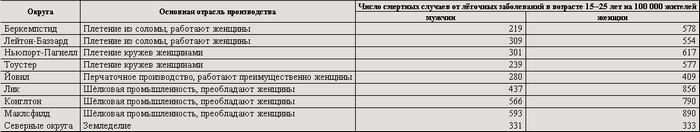 Статистика смертности в отраслях промышленности, в которых работы производятся в закрытых помещениях и которые в 1860 и 1861 гг. подверглись обследованию со стороны санитарного надзора, даёт следующие результаты: на то же самое число мужчин 15–55-летнего возраста, на которое в земледельческих округах Англии падает 100 смертных случаев от чахотки и других лёгочных заболеваний, приходится: в Ковентри – 163 смертных случая от чахотки, в Блэкберне и Скиптоне – 167, в Конглтоне и Брадфорде – 168, в Лестере – 171, в Лике – 182, в Маклсфилде – 184, в Болтоне – 190, в Ноттингеме – 192, в Рочдейле – 193, в Дерби – 198, в Солфорде и Аштоне-андер-Лайн – 203, в Лидсе – 218, в Престоне – 220 и в Манчестере – 263 (стр. 24). Нижеследующая таблица даёт ещё более разительный пример. Она показывает количество смертных случаев от лёгочных заболеваний отдельно для обоих полов в возрасте от 15 до 25 лет на каждые 100 000 телей.