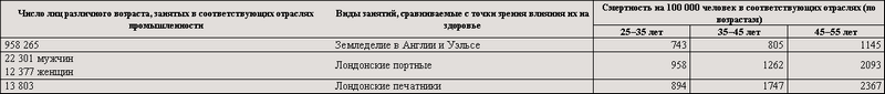 Необходимо отметить – и это действительно отмечено Джоном Саймоном, составителем отчёта, заведующим медицинским отделом, – что для лиц в возрасте 25–35 лет приводятся заниженные цифры смертности среди портных, наборщиков и печатников Лондона, так как в обеих отраслях промышленности лондонские мастера получают из деревни значительное число молодых людей (вероятно, до 30-летнего возраста), работающих в качестве учеников и «improvers», т. е. совершенствующихся в ремесле. Они увеличивают общее число занятых в промышленности, на которое рассчитывается процент смертности промышленного населения Лондона; но число смертей в Лондоне среди них меньше, чем среди других рабочих, так как их пребывание в городе лишь временное; если они заболевают в течение этого времени, они возвращаются домой в деревню, где и регистрируется их смерть, когда болезнь имеет смертельный исход. Это в ещё большей степени касается более ранних возрастных групп, и потому лондонские цифры смертности для лиц этих групп лишены всякого значения в качестве показателя вредности промышленности для здоровья (стр. 30).