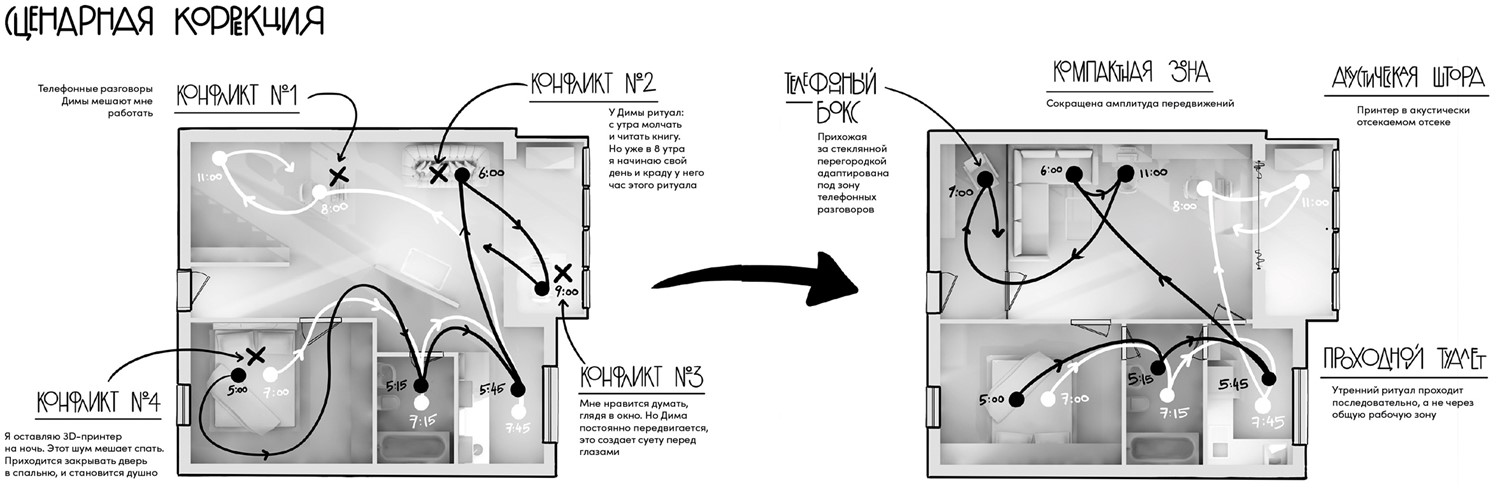 Работа со сценариями важна, когда вы хотите управлять собственным поведением. Например, чтобы оградить себя от залипания в соцсетях с утра, в фазе «пробуждение» вы устраняете любые гаджеты вплоть до того момента, пока не выполните ряд необходимых для «идеального утра» действий. Когда в квартире живет несколько человек, вы можете снизить уровень домашней суеты для более продуктивного проведения онлайн-встреч, корректируя траектории передвижений домочадцев. При этом их функционал не страдает, каждый занимается своим делом. Более глубокая проработка подразумевает прогнозирование не только движений тела, но и взгляда или звуков. Поворачивая столы, размещая в определенных местах акустические панели или отражатели, вы тем самым снижаете шумовую нагрузку либо настраиваете вид, открывающийся перед вами во время работы, общения или отдыха. Можно менять траектории движения воздуха, открывая окна специфичным образом и корректируя естественные сквозняки, повышая воздухообмен простейшими электротехническими средствами (условно назовем их вентиляторами). Вы используете элементарные знания, в жарком климате располагая рабочие места ниже, а в холодном – выше, например на антресолях или используя высокие столы и стулья. Все это реально сделать в небольшом помещении, и, более того, частично вы это уже практикуете, осознанно или нет.