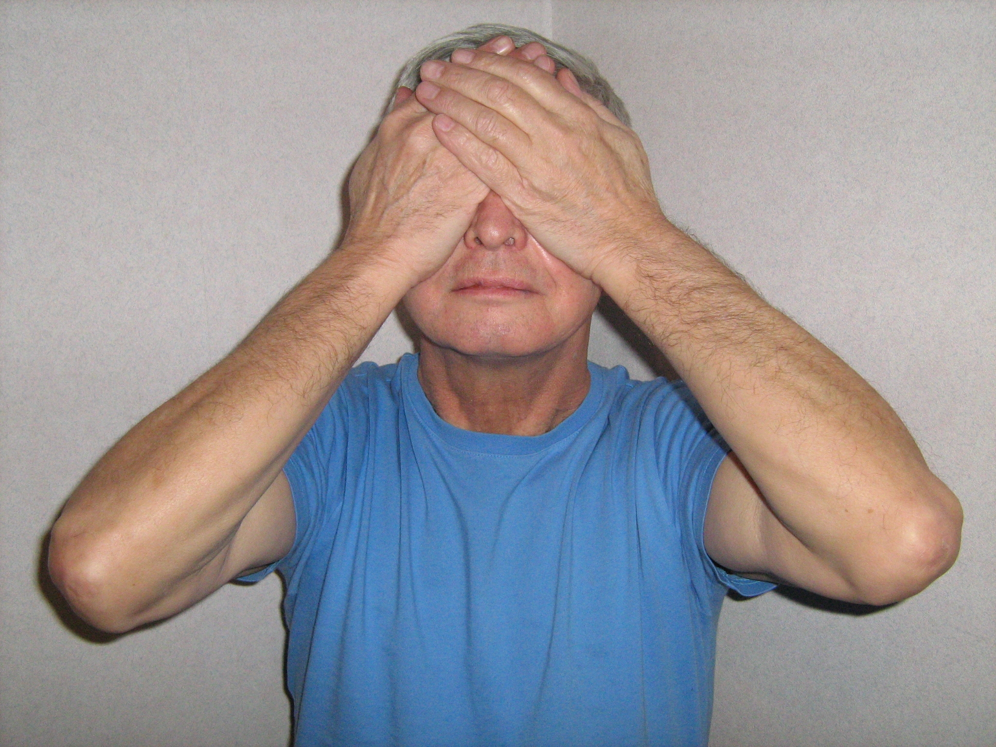 Первый этап – это предварительно разогретые ладони рук (растертые друг о друга), фиксированные в области мизинцев под углом 90 градусов, закрывающие область глаз. Глаза следует закрывать под ладонями только при полном отсутствии проникновения туда света. При правильном наложении ладоней рук, даже при открытых глазах под ладонями восстанавливается полная, приятная по ощущениям, темнота. После этого глаза закрыть. Возникающие перед глазами звездочки, разноцветные полоски, мерцание, прыгающие шарики – признак усталости или переутомления глаз и «показание» к обязательной разгрузке. По мере того, как закрытые глаза будут получать тепло из центральных точек разогретых ладоней, находящихся прямо напротив центра каждого глаза, «калейдоскоп» будет исчезать, за счет снижения напряжения и устранения источника раздражения. Критерием окончания первой части «Пальминга» будет служить возникшее ощущение темного однородного фона и тепла,окутывающего глаза. Время может варьироваться от 2 до 5 минут. После этого глаза остаются закрыты, а руки медленно и плавно опускаются вдоль туловища.