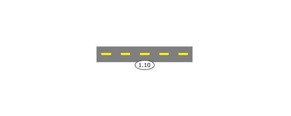 1.11 (штрих-сплошная белого цвета) — разделяет транспортные потоки противоположных или попутных направлений, обозначает места предназначенные для разворота.