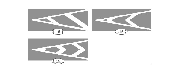 1.16.1—1.16.3 – обозначает направляющие островки в местах разделения или слияния транспортных потоков. Движение ТС должно осуществляться со стороны острия углов, образуемых широкими линиями разметки.