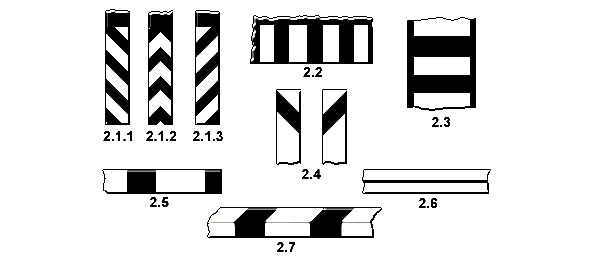 2.1.1 – 2.1.3 – обозначают элементы дорожных сооружений (опор мостов, путепроводов, торцевых частей парапетов и тому подобного), когда эти элементы представляют опасность для движущихся транспортных средств.