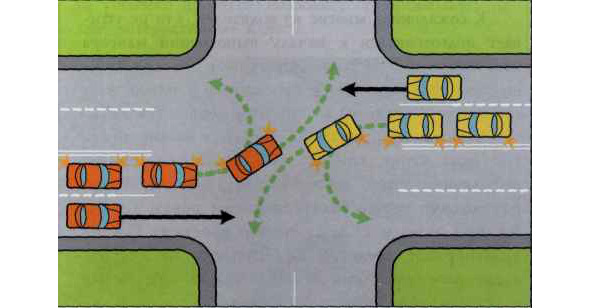 При разъезде левыми бортами обоим ТС может не хватить места для выполнения безопасного поворота. На рисунке показан поворот налево на узком перекрестке левыми бортами. Поэтому лучше всего водителям встречных автомобилей проехать этот перекресток по «обоюдной договоренности». Просто один из водителей, не выезжая на перекресток, может показать рукой, что он пропускает встречного. Такое простое решение полностью позволит исключить возможность появления какой-либо конфликтной ситуации при проезде перекрестка.