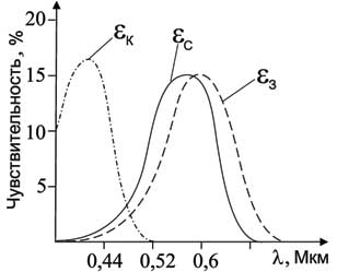 Существует три типа колбочек, входящих в сетчатку, называемых «красные», «синие», «зеленые», которые различаются по чувствительности к различным участкам длины волн λ светового излучения. На рисунке 1.1 приведены кривые спектральных чувствительностей трех типов колбочек, выраженных в процентах, поглощенных зрительными пигментами квантов.