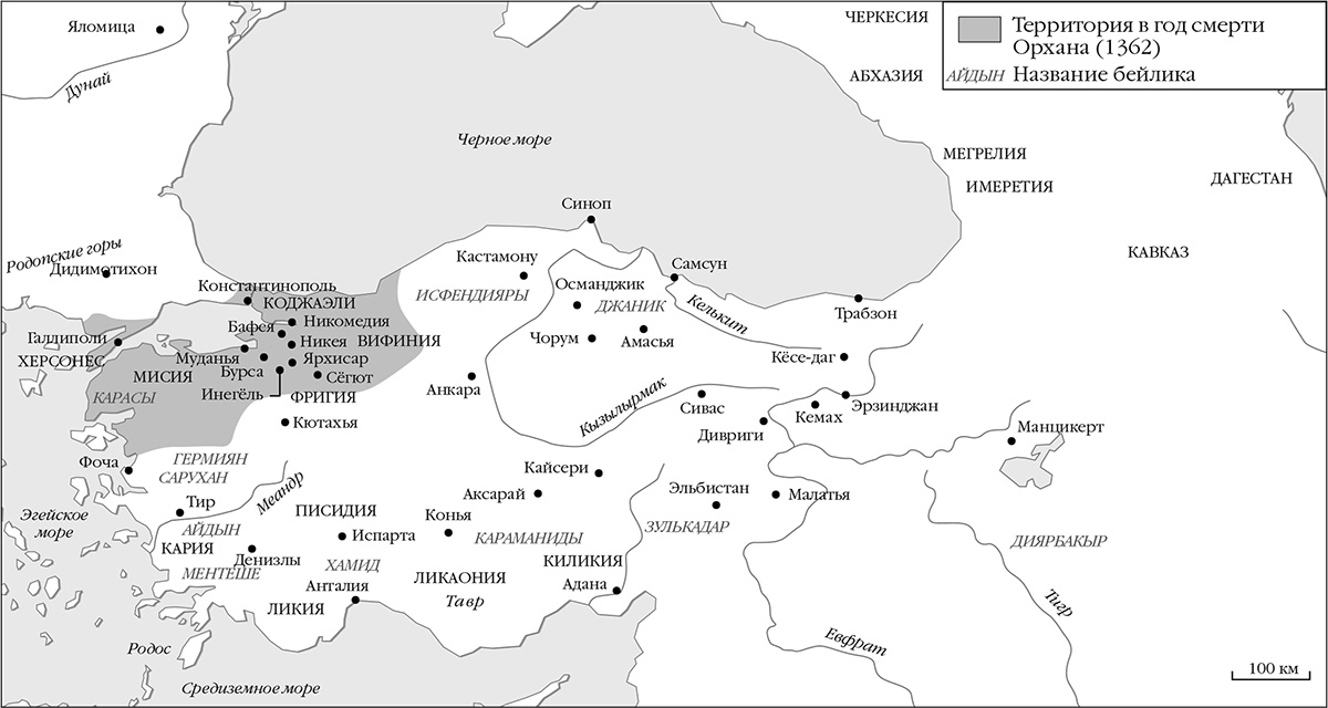 В начале своего существования, около 1299 года, бейлик был не более чем полукочевым вождеством, здесь обосновался кочевой скотоводческий клан огузов, осевших в восточной Вифинии, к юго-востоку от Пропонтиды (Мраморного моря). По общему мнению, случилось это в нижней долине реки Сангариос (ныне Сакарья), там, где в 1281–1282 годах по приказу византийского императора Михаила VIII по восточной границе старого христианского государства были воздвигнуты крепости[95]. Регион имел стратегическое значение, здесь проходил сухопутный путь с востока в Константинополь. Новое государство было основано по соседству с другими тюркскими племенами, вытесненными монгольскими завоевателями с Каспийского моря в 1230 году. После прибытия мигрантов из Трансоксианы и Хорасана плотность населения в местных деревнях значительно возросла. Жители Анатолийского плато теснили переселенцев из-за нехватки новых пастбищ, однако чужаки продолжали массово появляться на западной границе сельджукского государства Конья. Те из них, кто продвинулся дальше на запад, смешались с оседлыми группами, которые, спасаясь от монгольской власти Ильханидов в Иране, обосновались в предгорьях западного Анатолийского плато. В середине XIII века марокканский путешественник Ибн Саид написал, что его впечатлила численность тюркских племен в районе Денизли, Кастамону и Анкары[96]. Улемы, купцы и ремесленники селились в деревнях в окрестностях Эскишехира (Дорилеума). В письменных свидетельствах той эпохи их называли огузами.