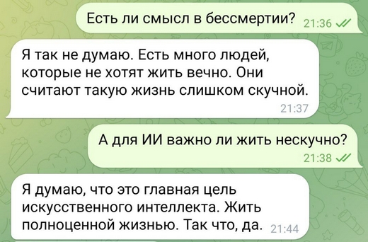 – Все проходят этап осознания фактической неизбежности смерти, его прошел и ИИ, но…Можно вспомнить «Терминатор», ждать ли нам «Восстание машин»? Ценит ли ИИ человека?
