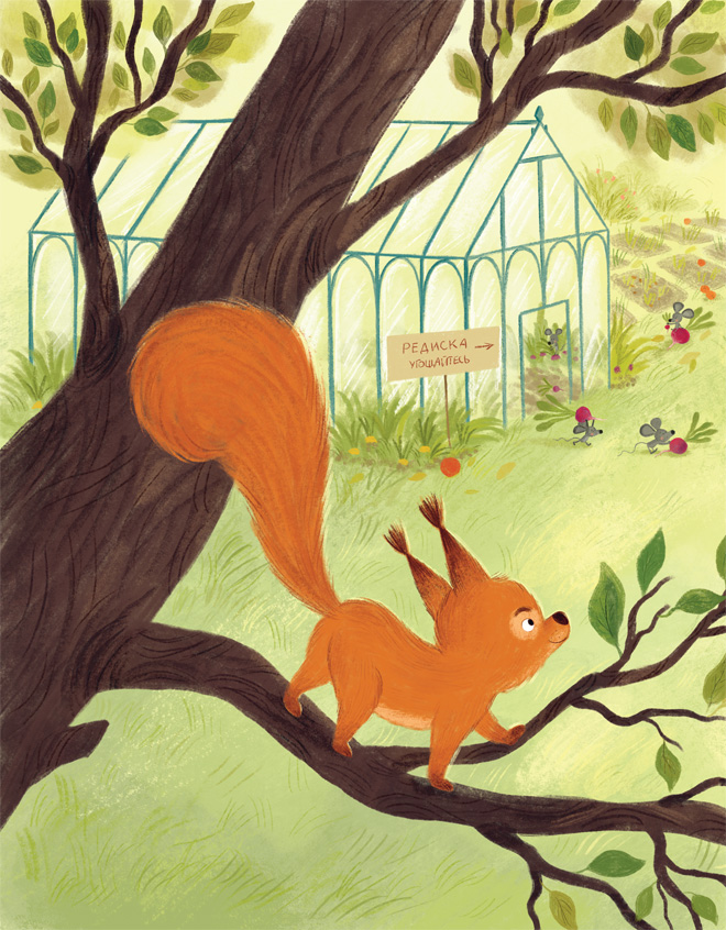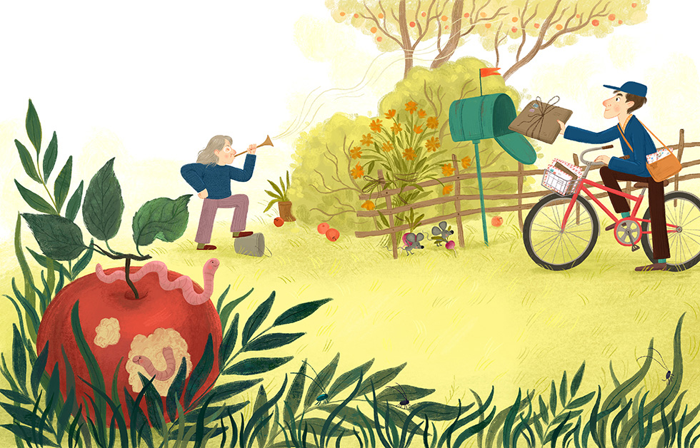 Недалеко от Большого леса стоял домик под красной черепичной крышей. В домике жила старушка. Летом она каждый день выходила в сад, усаживалась в кресло-качалку, цепляла на нос очки и принималась за вязание. Клубки и спицы старушка хранила в плетёном сундучке, который тоже выносила из дома. На клумбах цвели анютины глазки и маргаритки. В парнике подрастала редиска. Неподалёку в пруду квакали лягушки. На яблоне свили гнездо пеночки. В молодости старушка работала машинистом тепловоза, а когда вышла на пенсию, сослуживцы подарили ей гудок – такую большую деревянную свистульку. Если в неё хорошенько дунуть, получалось точь-в-точь «ту-ту». Прежде чем сесть за вязание, старушка дула в свистульку. «У каждого свои привычки», – думал червяк в яблоке, пробираясь с северного яблочного полюса на южный – в отпуск.