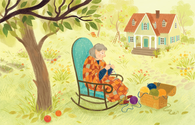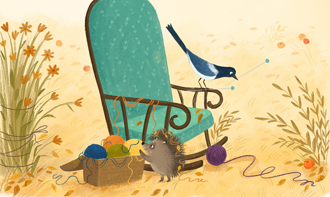 День шёл за днём. Лето закончилось. Однажды в сентябре старушка вышла в сад, насвистывая «Во саду ли, в огороде», откинула крышку плетёного сундучка, посчитала разноцветные клубки и задумалась. На забор уселась сорока. Она летела по своим делам, но увидела, как блеснули в старушкиных руках спицы, и сразу захотела такие в свою коллекцию сокровищ.