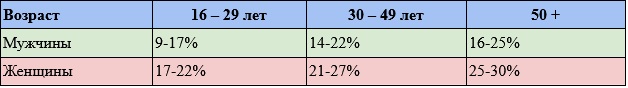 Существуют разные таблицы норм жировой ткани у мужчин и женщин согласно возраста, поэтому в качестве ориентира приведу одну из них: