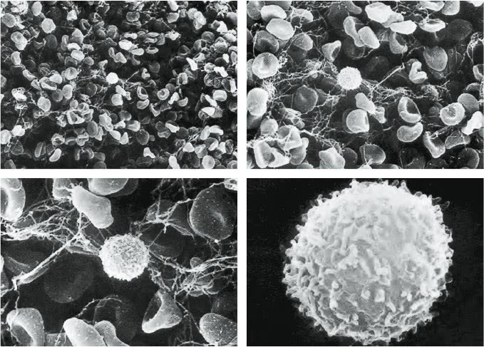 Электронные микрофотографии клеток крови человека (с последовательным увеличением). На верхнем снимке большинство клеток – красные кровяные тельца. Клетка, которая занимает весь нижний снимок, это B-лимфоцит, внутрь которого мы заглянем на следующей странице. Его диаметр – около одной десятитысячной сантиметра.