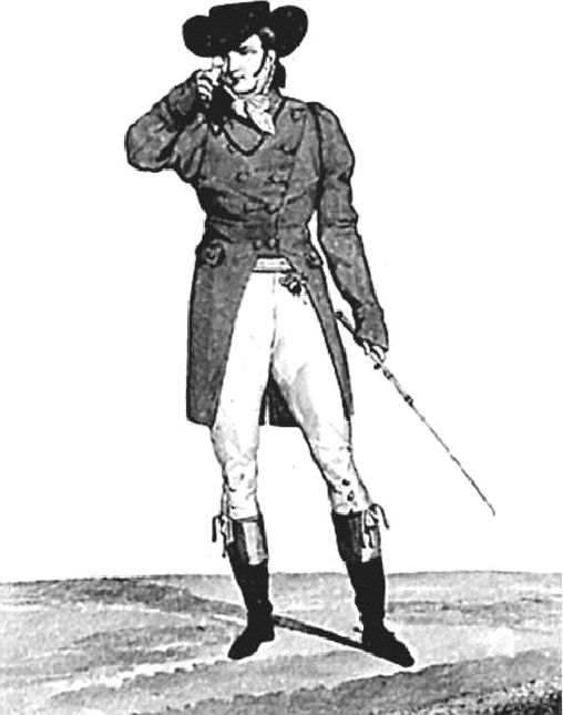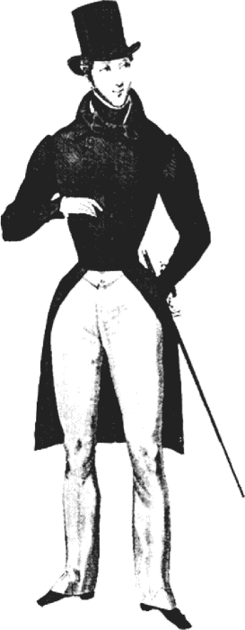 Под жилет одевалась белая сорочка с широким жестким воротничком, подпиравшим вздернутый подбородок, что придавало его владельцу слегка высокомерный вид. Завершал костюм элегантно повязанный шейный платок из муслина.