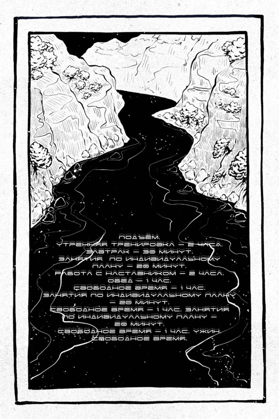 «Подъём. Утренняя тренировка – 2 часа. Завтрак – 30 минут. Занятия по индивидуальному плану – 20 минут. Работа с наставником – 2 часа. Обед – 1 час. Свободное время – 1 час. Занятия по индивидуальному плану – 20 минут. Свободное время – 1 час. Занятия по индивидуальному плану – 20 минут. Свободное время – 1 час. Ужин. Свободное время».