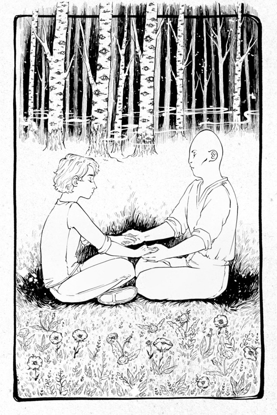 С одной стороны – берёзы, с другой – поляна, заросшая травами и полевыми цветами. Солнце светит так ярко, что хочется зажмуриться. И мы с Тоутом, голова которого под лучами сияет, как начищенный тазик, сидим друг против друга, держась за руки.