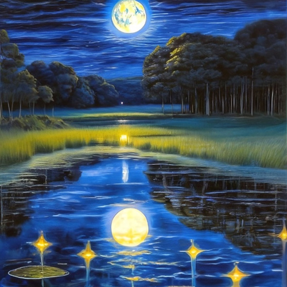 Настала ночь. Луна вгляделась :Темна ли вешняя вода?Ей вдруг увидеть захотелось,Что отражает гладь пруда?Луна, увидев отражение,В молчании замерла на миг,В восторг придя и удивление:Чей лик в пруду сейчас возник?Луна глядится осторожно,А отражение-на неё.Поверить в это невозможно,Как будто сон иль забытьё.В зеркальной глади она видитНочное небо и Луну:«Златые звёзды, разъясните,Что происходит, не пойму?»Откуда две луны, два неба?Двоится все теперь в глазах.Как это странно и нелепо,Одной быть сразу в двух местах.