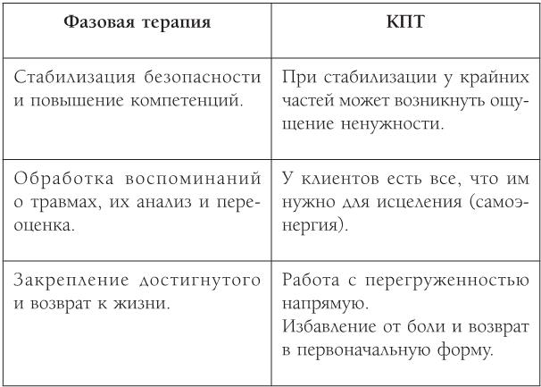 Еще одно важное различие между КПТ и фазовым подходом заключается в том, что КПТ предлагает способ напрямую справиться с подавляющими чувствами (см. Главу 9), а не усиливать сильные стороны и ресурсы, которые клиент может использовать для управления интенсивностью травматического эффекта. Дик Шварц учит, что, если вы напрямую поговорите с частью, испытывающей переполняющие чувства, и попросите ее не перегружать клиента, – она подчинится, чтобы получить помощь и испытать облегчение.