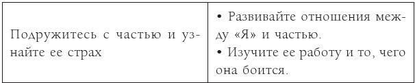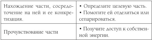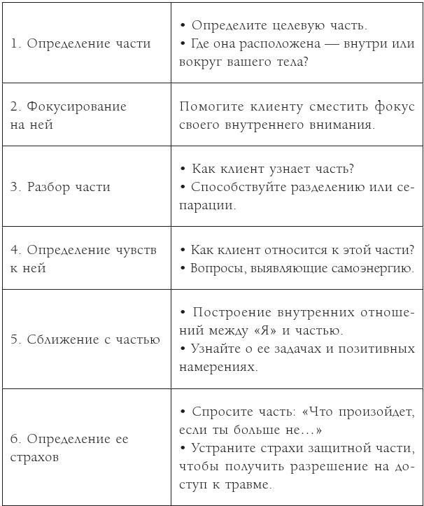 Как только мы установим внутренние отношения, важно наладить доверительные отношения между «Я» клиента и этой частью. Используя целебную способность самоэнергии, мы помогаем нашим клиентам делиться своей любовью, ясностью и состраданием к этой части всякий раз, когда она проявляется во время сеанса. После установления безопасных отношений мы помогаем клиенту узнать о работе этой части и связанном с ней страхе, держа в уме, что основной страх часто важным образом связан с раной. Как только страх и рана определены, мы предлагаем альтернативное решение их ситуации, предлагая помочь исцелить рану, защищаемой ими. Ваша искренняя попытка услышать и понять позитивное намерение частей-защитников будет иметь большое значение для того, чтобы убедить их позволить вам получить доступ к травмированной части. Неважно с какой защитной части вы начнете, поскольку все они в итоге приводят к травмам.