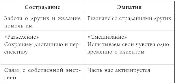 Однако слишком много сочувствия может поглотить нас и заблокировать нашу способность сохранять необходимую дистанцию и перспективу, требуемую для сострадательной позиции по отношению к нашим клиентам. Джен Кляйнер, моя подруга и коллега, напомнила мне, что бывают моменты, когда мы можем воспринимать чувства другого человека, необязательно испытывая к нему сострадание или сочувствие. Я с ней согласен: можно ощущать энергию и эмоции другого человека, не активируя собственные чувства. Именно это происходит с экстрасенсами и энергетическими целителями. Они обучены улавливать и ощущать чувства, мысли и убеждения других.