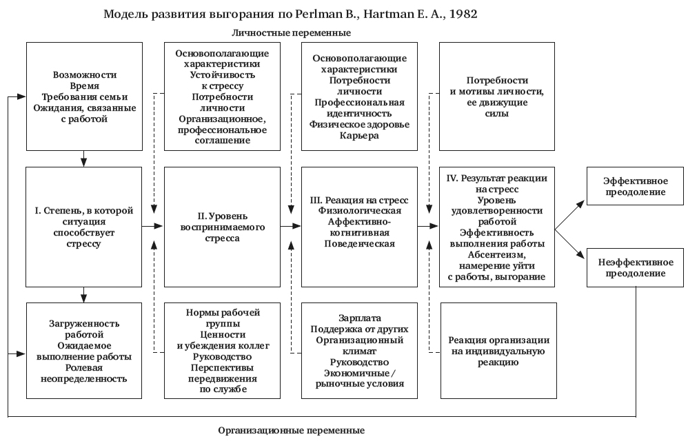Процессуальная модель Барона Перлмана и Алана Хартмана (Perlman B., Hartman E. A., 1982) представляет четыре стадии СПВ. Запускающим фактором ПВ являются противоречия между профессиональными ожиданиями и возможностями профессиональной адаптации работника.