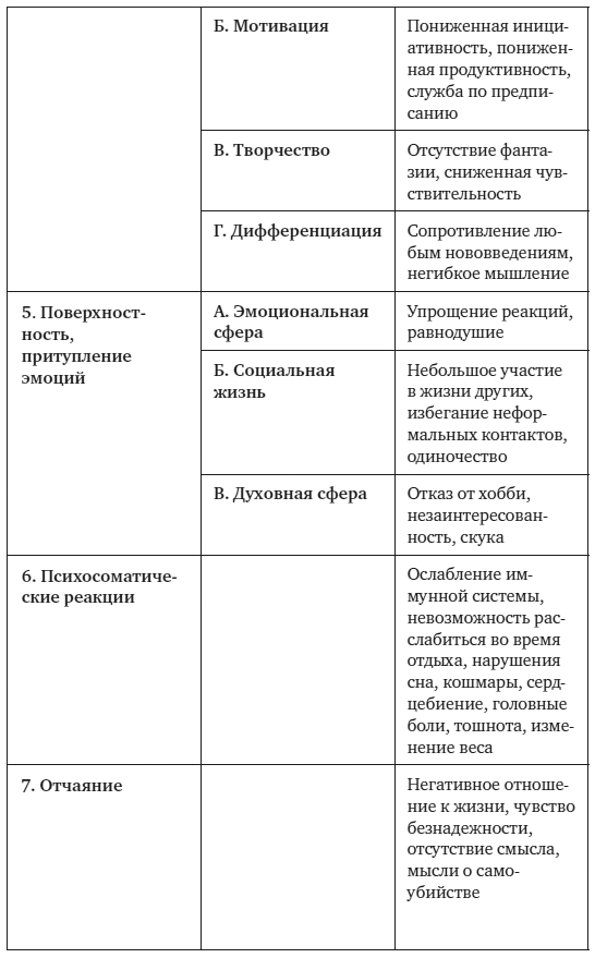В последующих фазах эмоционально-энергетические ресурсы уменьшаются и все слабее противодействуют нарастающему цинизму и ослаблению профессиональной эффективности. Постепенно наблюдается переход к энергетическому и эмоциональному истощению.