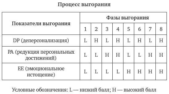 Роберт Голембиевски и Роберт Менценрайдер (Golembiewski R.T., Munzenrider R. F., 1988) описывают восемь фаз и три степени выгорания: низкий балл (в 1–3-й фазах), средний (в 4–5-й фазах) и высокий (в 6–8-й фазах). Эти степени выгорания соответствуют показателям эмоционального истощения, цинизма и снижения профессиональной эффективности по модели Маслач и Джексон (Maslach С., Jackson S., 1984).