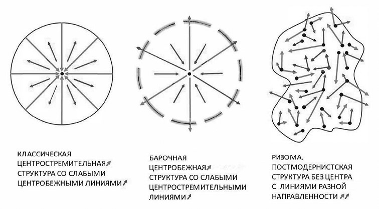 Теперь необходимо обратиться к структурным трансформациям. То есть к переходам от классической, целостной структуры к неклассической, барочной, разомкнутой. Когда произойдет перемена, то есть центробежные тенденции окажутся сильнее центростремительных, то на этапе, когда будет длиться борьба между ними, структура приобретет переходный характер. В дальнейшем она окончательно трансформируется в разомкнутую структуру, в которой центр или будет смещен, или вовсе исчезнет (см. рисунок). Эта структура в философии постструктурализма получила название ризомы9.