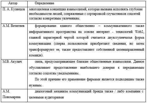 Существует множество подходов и трактовок к определению социальных сетей с позиции различных сфер их применения. Рассмотрим различные подходы авторов в определении социальных сетей в маркетинге (таблица 1.1).