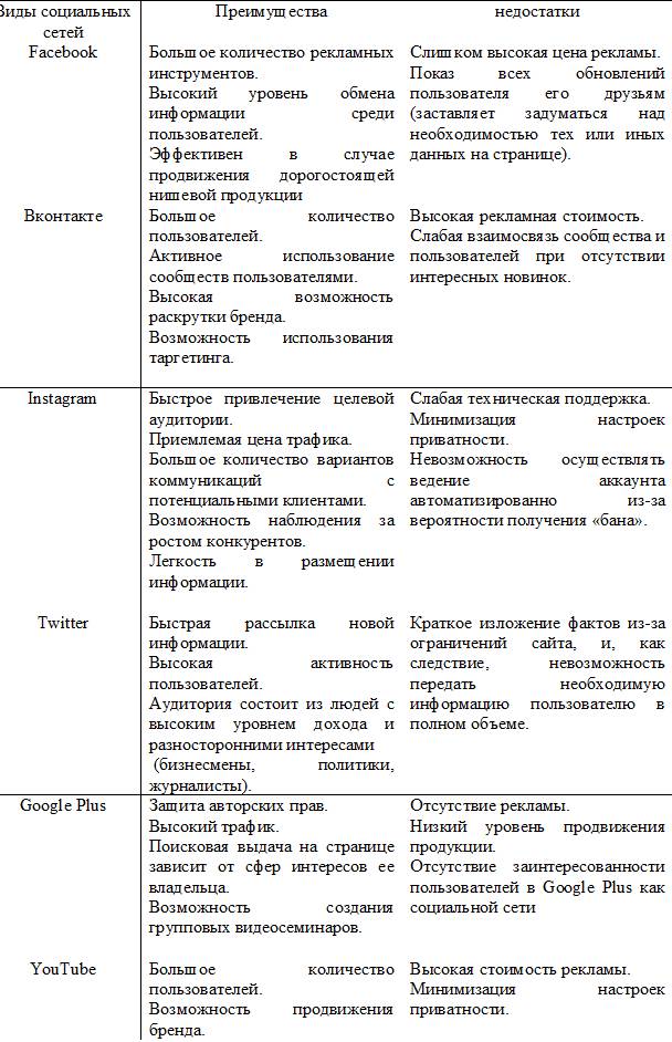 В этот период мы стремительно применяем значительно платформ, нежели когда-либо – это не только лишь распространенные Вконтакте, Одноклассники, Facebook, Интернете и Twitter, это еще и социальный интернет – сервис и фотохостинг Pinterest, деловая социальная сеть LinkedIn, услуги микроблогов Tumblr и Flickr, видеохостинги YouTube и Vimeo, новые форматы видеохостингов Coub и Вайн, а также индивидуальные месседжеры WhatsUpp, Viber и Telegram [8]. Проанализируем достоинства также недочеты SMM-продвижения (таблица 1.2). Проанализируем инструменты для некоторых соцсетей, основываясь на исследования аналитического портала рынка веб-разработок CMS Magazine, которые презентованы в таблице 1.3. Остальные сети работают, в сущности, те же методы – вы можете сами создавать страницы и их продвижение, продвигать сообщество с помощью таргетированной рекламы, использовать этот инструмент, как вирусный посев в популярных сообществах, промо-посты, ретаргетинг составленный базы данных заинтересованных сайтов или клиентов, с помощью размещения либо лидеров мнений.