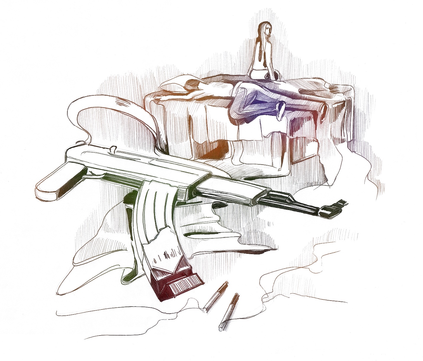 Дверь в коридоре открылась, и с улицы вползли страх и тревога. Ни колбаса диковинных неизведанных вкусов, ни пузырьки желтоватого, пахнущего ароматизированным спиртом шампанского, ни даже весело поющая о несчастной любви, переодетая школьницей Натали, не спасали от наступавшей неясной беды. Беда громыхала, скидывая тяжёлые ботинки, похлопывала по спине Тимура, хохотала басом и наконец ввалилась в гостиную. Их было трое. Девчонки тревожно переглянулись. Лысые, в кожанках и спортивных трико. У первого через плечо висел АК – 47. Лица пришедших были из тех, что «без особых примет».