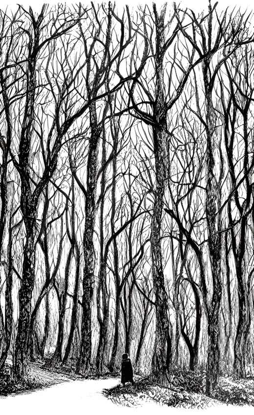 Мокрый весенний лес вытянулся стеной своими голыми стволами и ветками. Они поднимались к белому без единого просвета небу и смыкались над головой куполом из частых угольных штрихов, слегка покачивающихся на раскатах редкого ветра. Земля ещё несла на себе подтаявшие ледяные корки снега, но кое-где уже зияла чёрными дырами в размытой оттепелью подстилке из прошлогодней листвы и хвои.