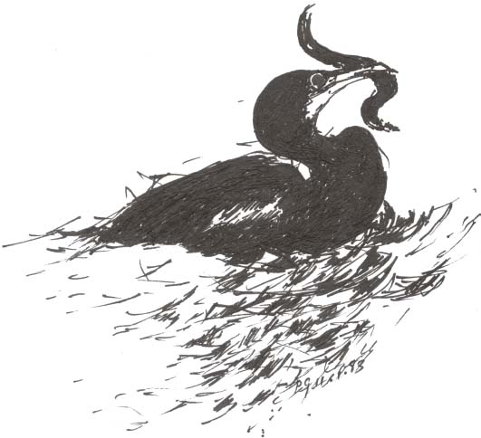 One autumn morning, after a terrific storm that had swept over the Cape and depressed my spirit with its violence, I woke at dawn to find the sea in front of Pat’s house filled with cormorants, hundreds of them. Driven off the breakwater, they’d gathered in a dense raft, avian refugees in an abstract arrangement, each sharp upturned yellow bill, white throat and sinuous neck creating a repeated rhythm, a crazy cormorant expressionism. A scattering of sea crows, marks on the water.