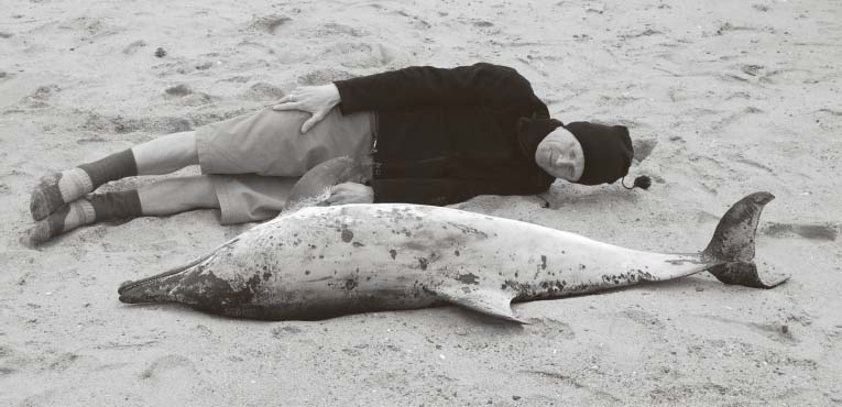 I run my hands over its body. The fins are finely shaped, rubbery and tactile, caressed and caressing when alive; the taut flanks taper to the muscular tail. The eyes are disconcertingly open, unseeing, untouched by the gulls, which often fall to feed on stranded cetaceans even before they’ve expired. Clearly displayed on its underbelly is the animal’s genital slit, flanked by two smaller mammary slits, betraying, in this indecent exposure, its sex. I insert my finger, ostensibly to investigate if she, as she had now become, had bred, but in reality out of prurient curiosity.