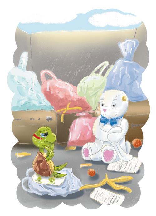 Но случилось то, чего находчивый черепашонок предугадать не мог. Пришёл папа из магазина и протянул маме продукты, а она ему взамен – мусор.