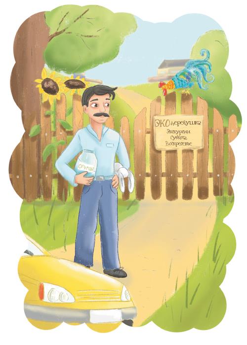 В будни обитатели «Экодеревушки» жили обычной жизнью, а в выходные показывали себя посетителям. Хозяйка усадьбы заметила гостя и поспешила к нему навстречу. В шляпке с коричневой серединкой и жёлтыми цветочками на полях она была похожа на подсолнух.