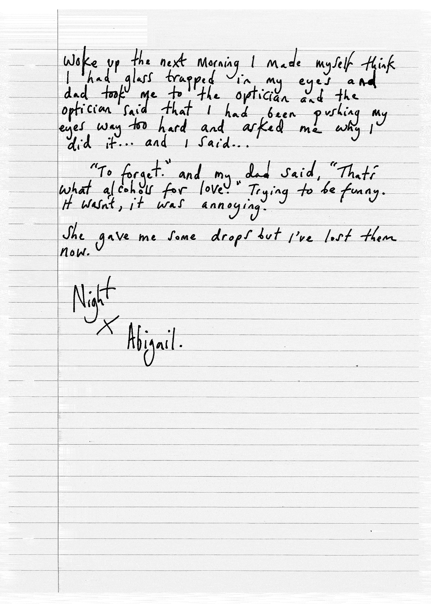 Matt was so polite and so protective of Abigail he would just play along with the comments, laughing hysterically, creasing his newly wrinkled face and sometimes overacting by putting a hand on his stomach. ‘You guys!’ he’d hoot breathlessly, dramatically slapping his thigh. Matt wasn’t fooling anybody; he was as transparent as a looking-glass. Abigail knew that she had no friends; she knew that she was the pinnacle of everybody’s fun and she knew that it was her that everybody was laughing at. She just knew.