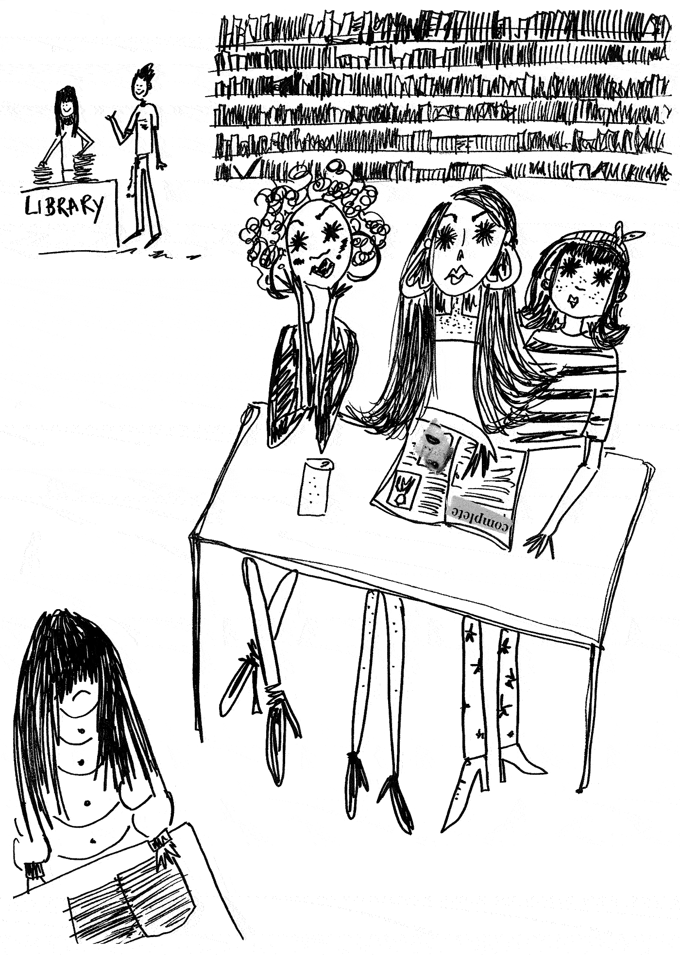 Matt was engulfed in some meaningful conversation about Japan with the librarian. Rebecca, Florence and Leilah paraded in through the library doors like three long-legged exotic birds and began gabbling over the other side of the room,