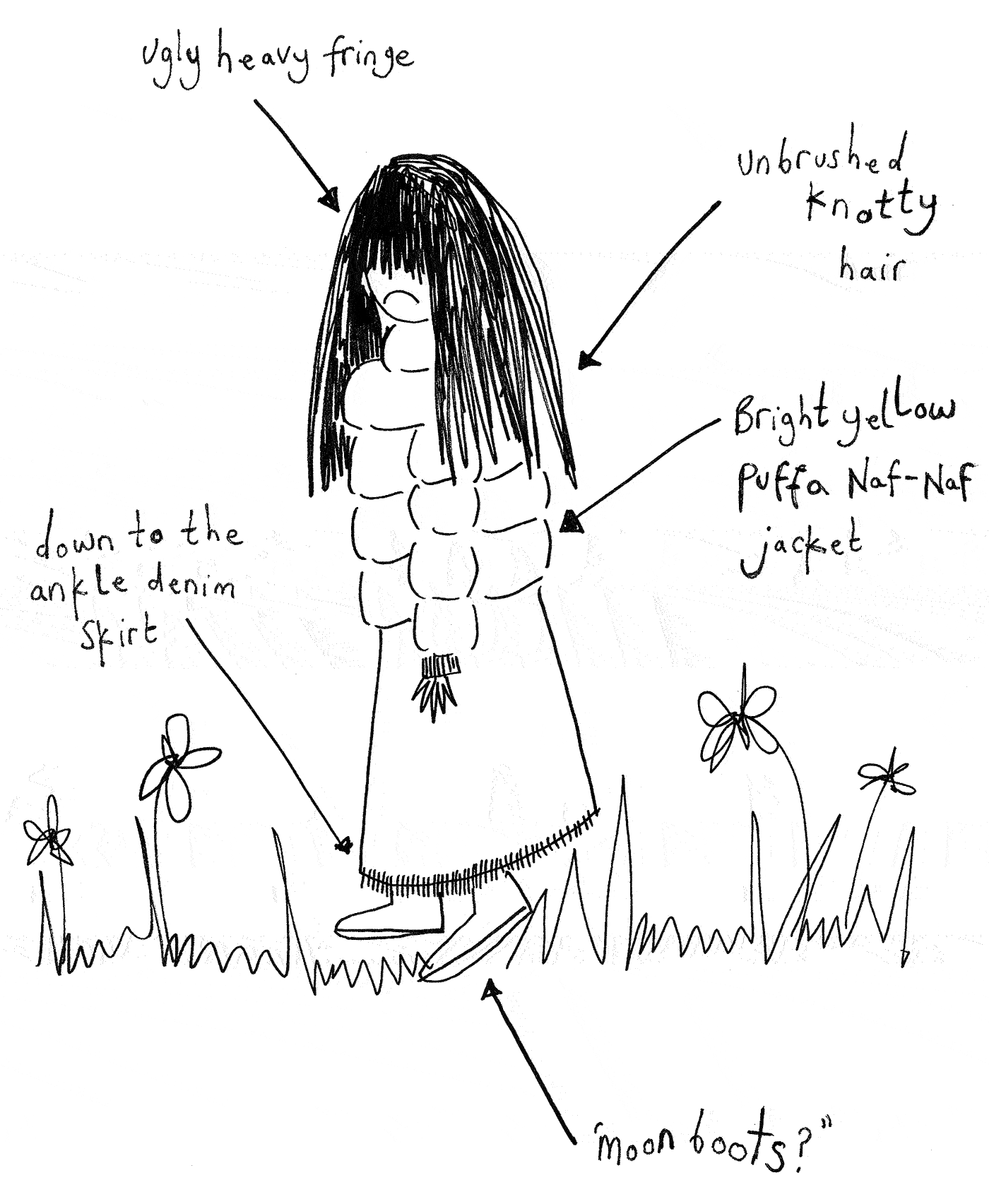 ‘Well you’re lucky, it’s disgusting,’ Rebecca said, peering back down at her magazine. ‘I’m bored of this, let’s go and watch Amy Benton in her leotard, she’s got stretch marks up to her eye balls.’