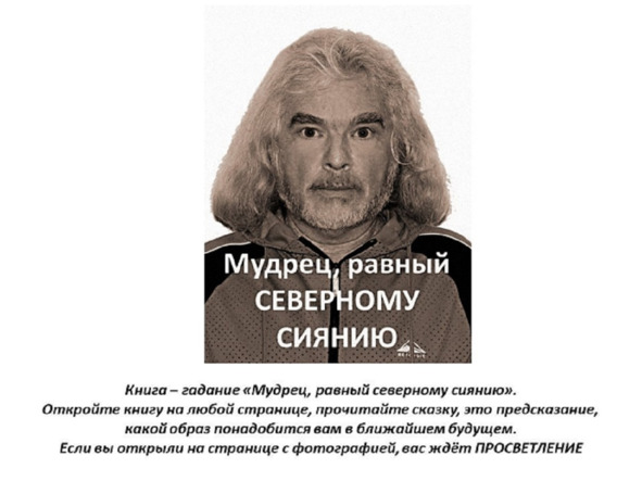 В России к гадалке не ходи – и так понятно, скучно не будет. Важно узнать, чего не хватает в образном восприятии мира, чтобы преодолеть следующую проблему. Бумажную книгу «Мудрец, равный северному сиянию» надо раскрыть на случайной странице, прочитать сказку о северосиятельном методе образного восприятия мира. Электронный вариант не дает такой возможности, потому что электронные тексты быстро меняются.