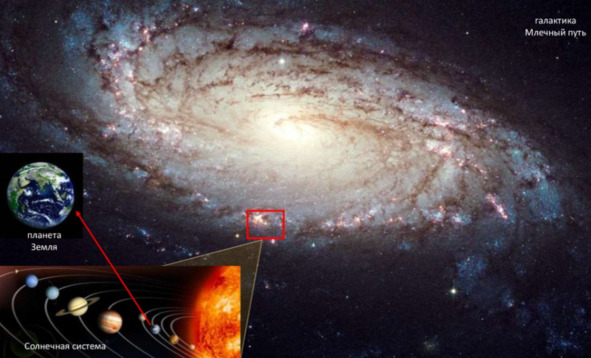 Ваш город – страна – континент – планета Земля – Луна – орбита Луны – околоземные астероиды – планеты земной группы – планеты-гиганты – пояс Койпера – карликовые планеты – внутреннее облако Оорта – внешнее облако Оорта – соседние звезды – местное межзвездное облако – Местный пузырь – Спиральные рукава – Млечный Путь – соседняя галактика – Местная группа галактик – Местное сверхскопление галактик – Великая стена Слоуна – Вселенная.