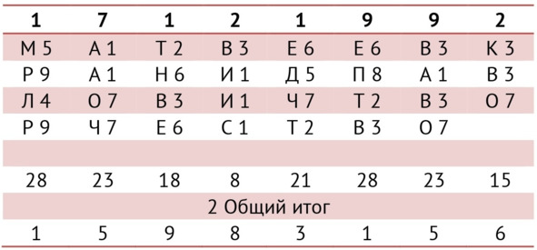 Далее необходимо полученное значение сложить с «общим итогом» (как рассчитать общий итог, смотрите в книге №5 на с. 89). После чего приводим к интервалу от 0 до 9, т. е. складываем между собой столько раз, сколько потребуется для конечного результата.